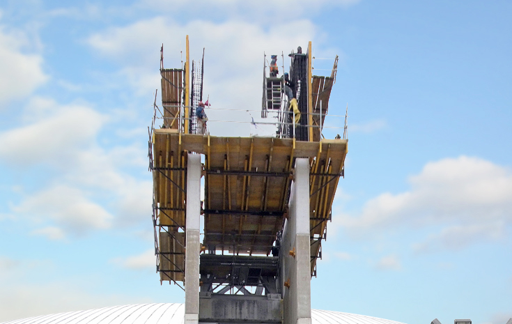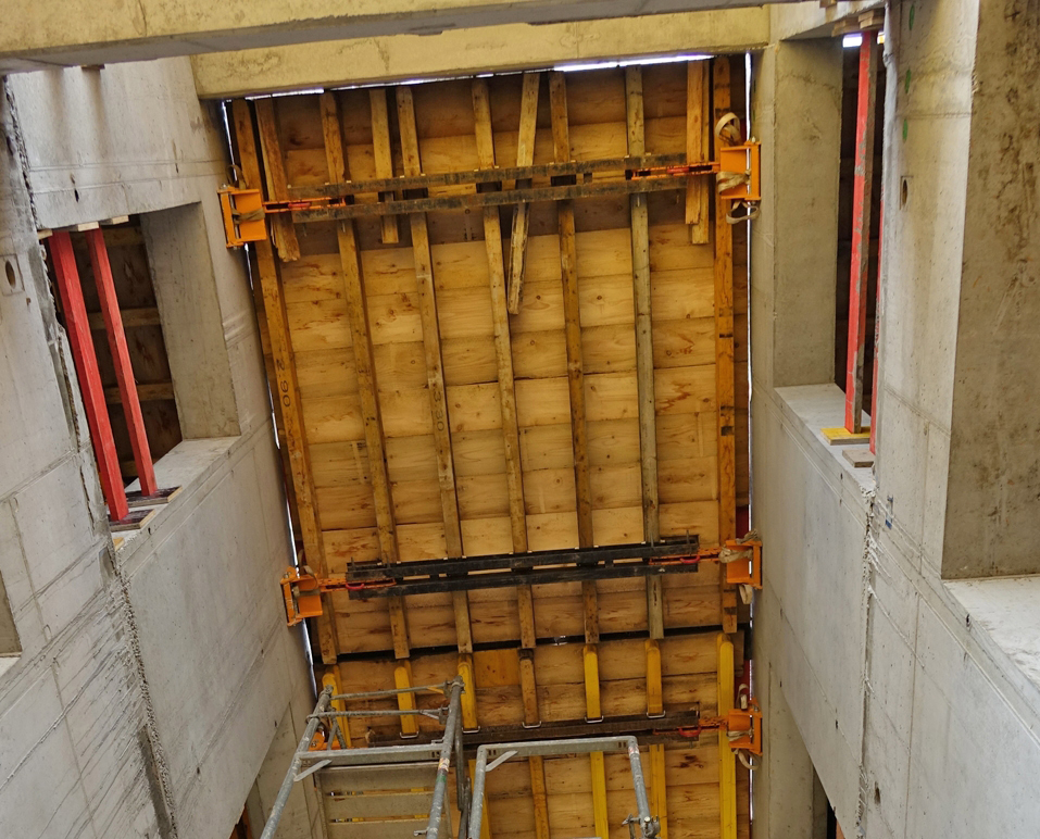 La plataforma para soporte de encofrado en huecos KSP es válida para huecos de ascensor y escalera, pilas huecas u otro tipo de cavidades donde sea preciso apoyar el encofrado. Habitualmente se combina con consolas de trepado convencionales en caras exteriores del muro.