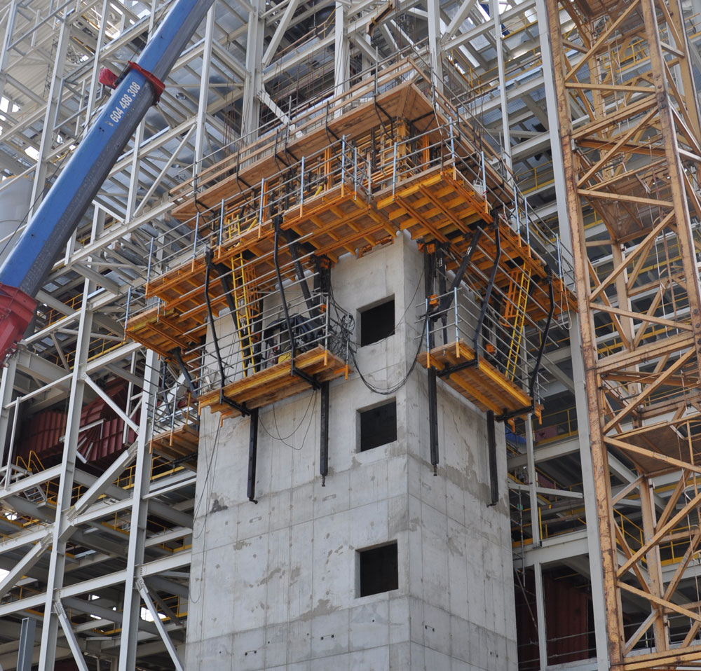 - Autonomía casi total con respecto a la grúa. Permite izado simultáneo de encofrado, plataformas de trabajo y distribuidor de hormigón