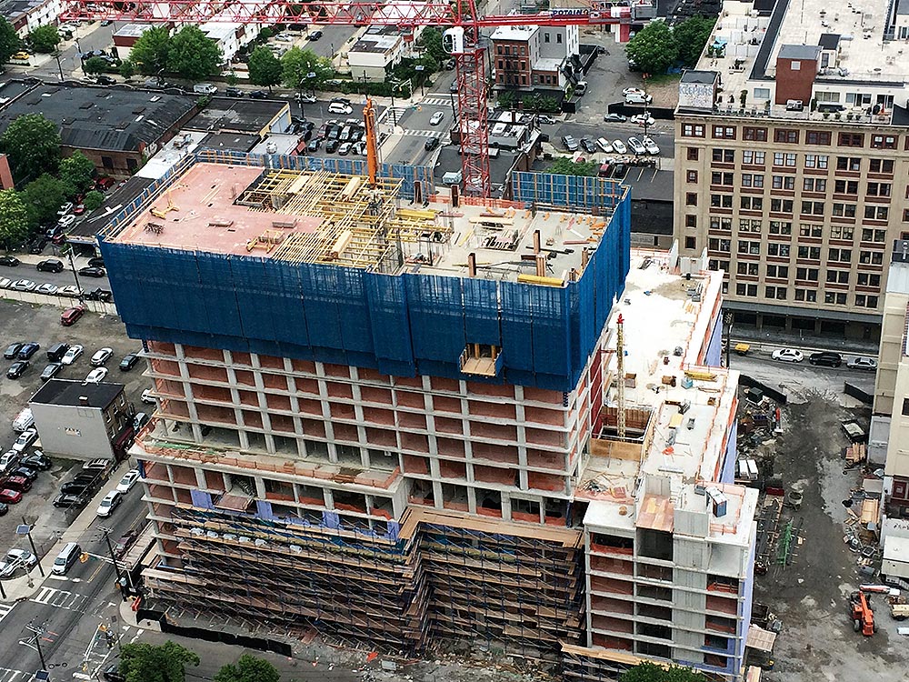 En el proyecto de Provost Square en New Jersey, EE.UU., se ha realizado el premontaje de los paneles en las instalaciones de ULMA, optimizando su tamaño para el transporte e incrementando los rendimientos de ejecución.