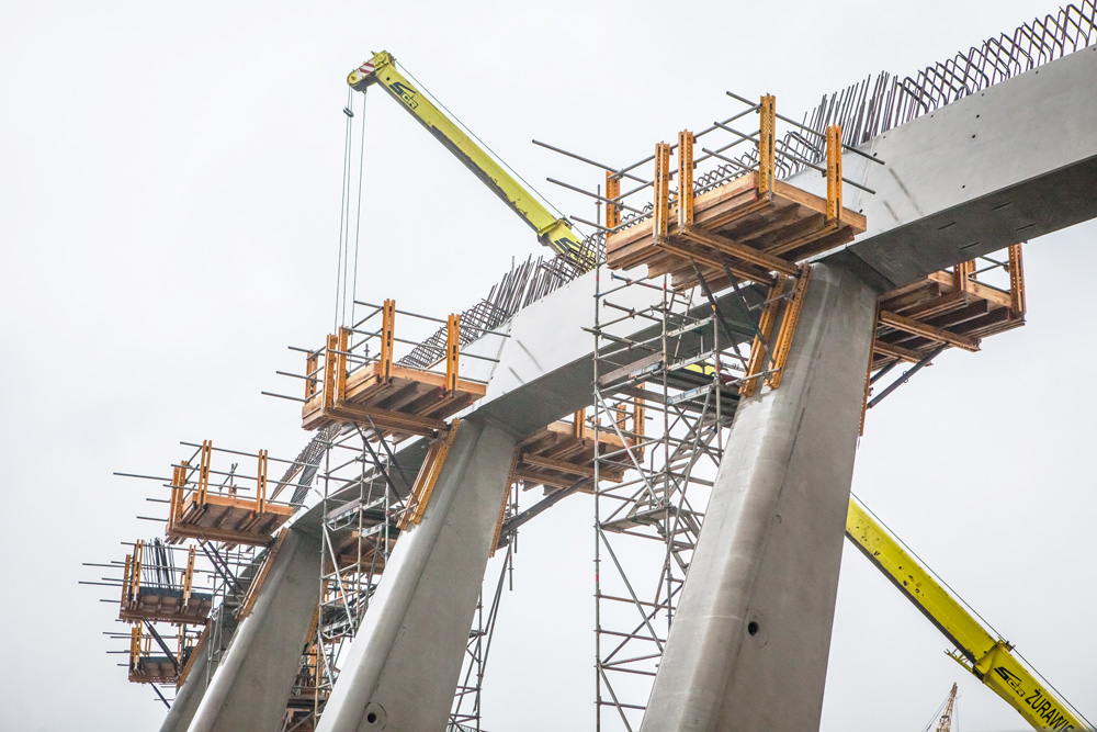 A 13 m de altura, la viga circular compuesta por vigas prefabricadas, requería de un espacio donde trabajar en la unión de los distintos segmentos. Las plataformas de trabajo de 2,25 x 2,65 m, diseñadas con el Sistema MK, han facilitado y asegurado así el hormigonado entre vigas.