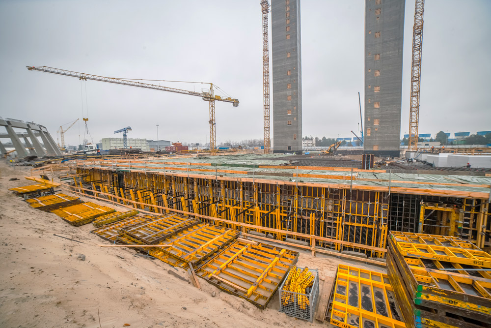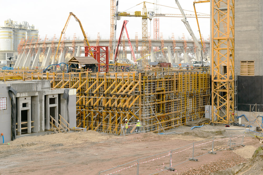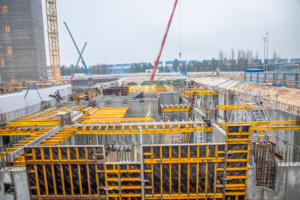 Con una dimensión de 87,1 x 63,35 m y alturas comprendidas entre los 3 y 6 m se han vertido más de 20.000 m3 de hormigón en una sola tongada. Los muros sólidos requeridos en las cimentaciones se han realizado con cerchas a una cara SMK, creadas con riostras MK, compatibles con cualquier encofrado de muro, en este caso, encofrado modular ORMA. Esta fase también ha incluido canalizaciones de 3,3 m de alturas ejecutadas con el mismo sistema de encofrados a una cara.