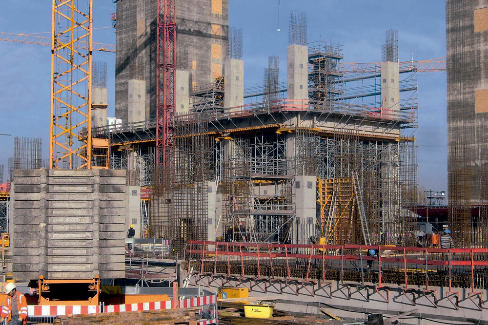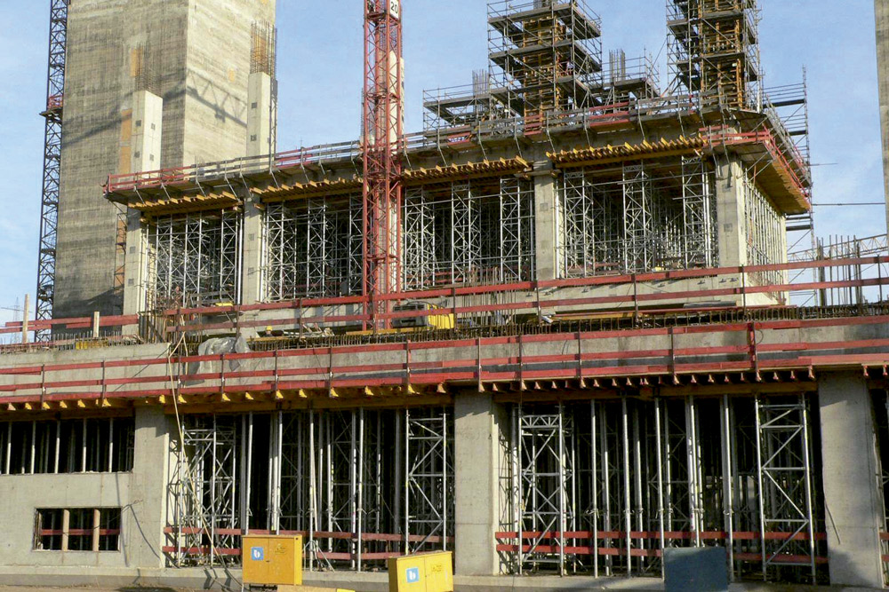 Este edificio de varias plantas, de 100 m longitud, 50 m de ancho y una altura de 43 m, requirió un sistema de zapatas sólidas de 2 m de espesor. Debido a los requisitos estáticos, los pilares, losas y vigas debían tener grandes dimensiones. De ahí que de acuerdo a los tiempos de trabajo reducidos y los consiguientes ciclos de ejecución, se emplease una amplia gama de productos del portafolio en la obra. El proceso de ejecución de muros, pilares y demás estructuras fue rápido gracias al empleo de 3.000 m2 de Encofrado Modular ORMA. La amplia gama de paneles posibilitó al cliente seleccionar el adecuado en este caso ya que sus longitudes y anchuras permiten su adaptación a las necesidades de cualquier obra. Además, todos los pilares estuvieron equipados con sus respectivas plataformas de trabajo, garantizando así la seguridad de los operarios en el proceso de hormigonado y en los trabajos en altura.
