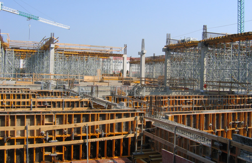 Las zapatas, divididas en 9 parcelas, se construyeron con el Encofrado NEVI, que facilitó su traslado sin el empleo de grúa desde la primera fase de obra. Asimismo, fue utilizado como encofrado de canto de vigasy de estructuras verticales, además de pilares con dimensiones de 70 x 70 cm. Los muros interiores también se ejecutaron con el Encofrado NEVI, con configuraciones de 2 x 3,30 y 2 x 2,70 m. Como sistema de seguridad y de comunicación vertical se utilizó el sistema BRIO.
