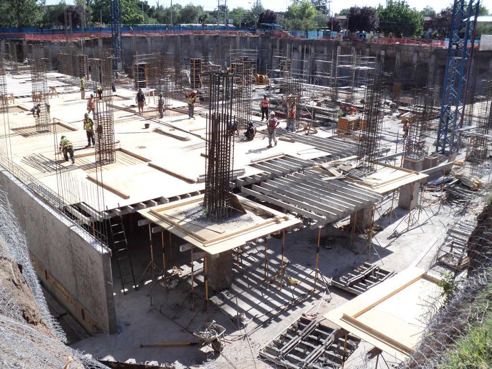 Las losas postensadas se instalaron mediante el sistema de vigas metálicas BTM apeado con Puntales SP. El apeo de la zona de acceso de gran altura se acometió con la Cimbra T-60. Con torres de fácil montaje y pocos elementos, estos sistemas fueron de gran aceptación en la obra, por la facilidad para superar desniveles en la cota inferior y por su gran rentabilidad.