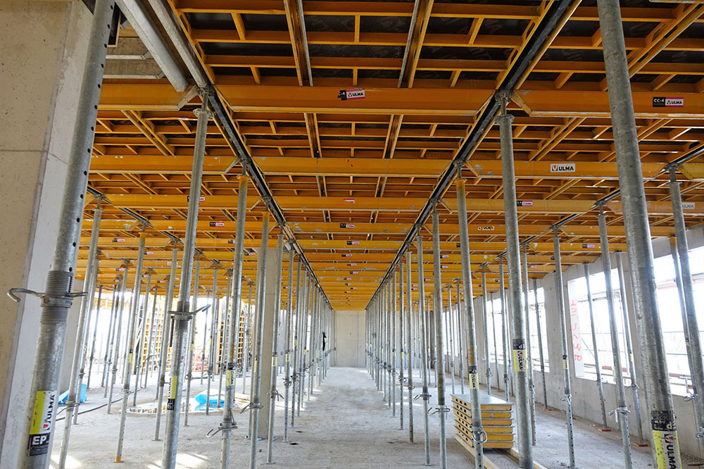 Los altos requisitos de diseño y el ajustado plazo de ejecución han podido llevarse a cabo gracias a la utilización del encofrado CC-4 que, frente al encofrado horizontal convencional, puede ser desencofrado a los tres días y estar preparado para la siguiente puesta al día siguiente.