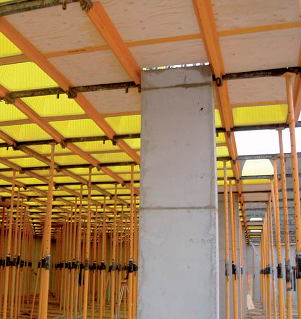 En la ejecución de los más de 26.000 m2 de losas aligeradas del edificio se utilizó el sistema RECUB. El diseño de sus componentes posibilitó que, en menos de 72 horas tras su hormigonado, se pudiera disponer de estos elementos para una nueva puesta. Este producto permite una mayor luz entre pilares, por lo que se reduce su número y aumenta el aprovechamiento del espacio. Además admite una distribución libre y estratégica de los pilares con lo que proporciona una gran flexibilidad para resolver proyectos que requieran espacios diáfanos como este hospital. El apeo de este encofrado se solucionó con Puntales SP responsables de transmitir las cargas de las losas.