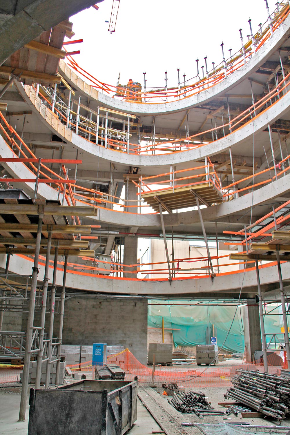 Ante estas premisas, se optó por el encofrado vertical NEVI, de fácil montaje y pocos accesorios. Se montaron grandes paños de 8 x 4 m fácilmente transportables con grúa.