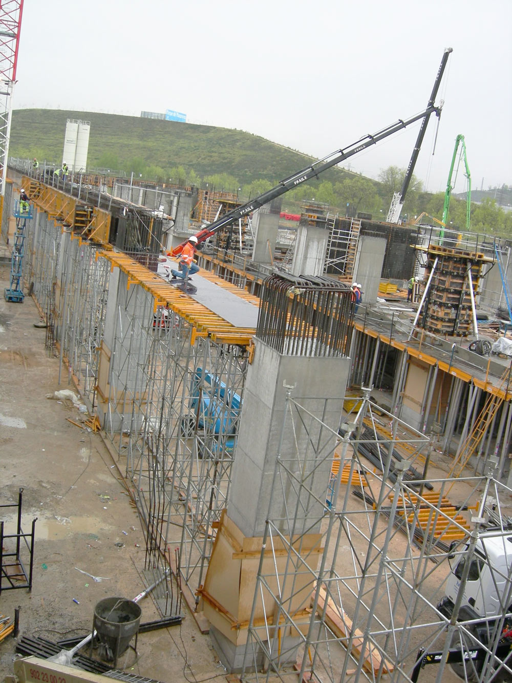 Los pilares de planta cuadrada de 1,5 m y casi 9 m de altura, al igual que las vigas, requirieron de un acabado de alta calidad.Para ello, se montó in situ el Encofrado Vertical ENKOFORM V-100 que permitió el vertido del hormigón en una única tongada.