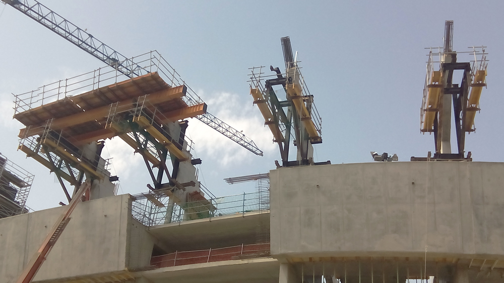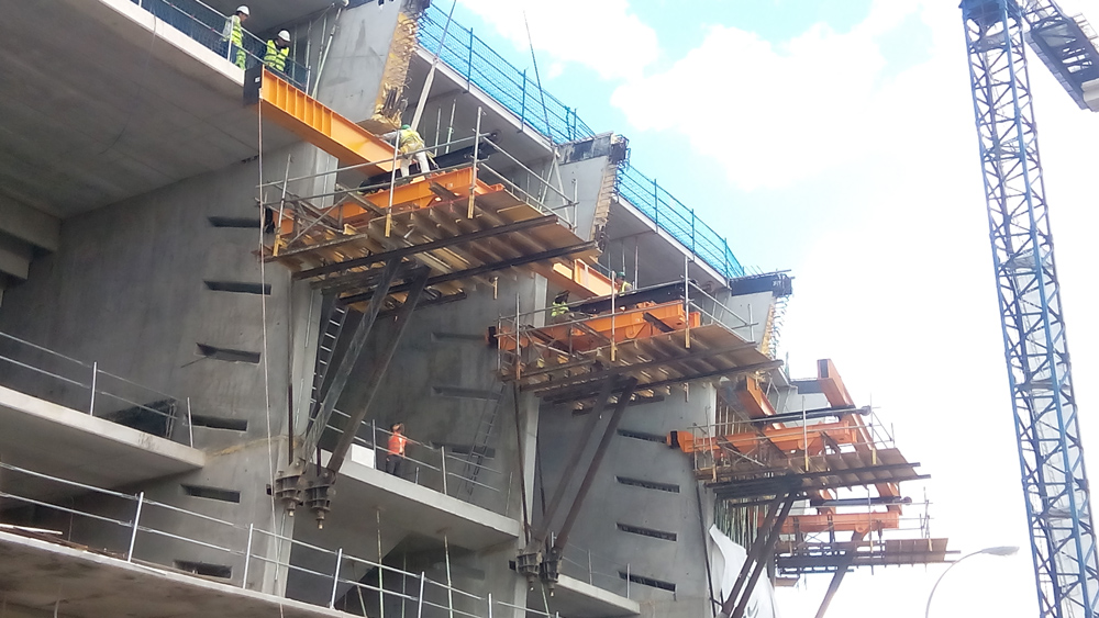 La opción a priori más sencilla era colocar torres de cimbra para hacer pórticos que soportaran el encofrado. Sin embargo, por la ocupación de la planta que suponían las torres se ha planteado una solución con consolas de gran carga que se han colocado en los pórticos de la estructura.