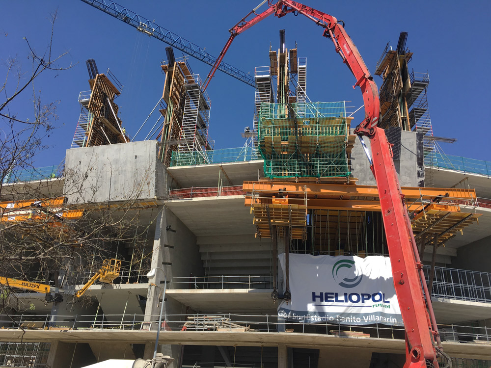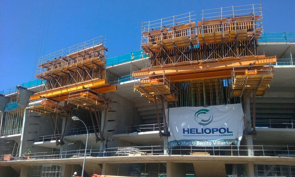 Con las consolas ubicadas en dos pórticos consecutivos se ha colocado entre ellas dos perfiles DIPE-600 de 15 m de longitud que sirven de apoyo al encofrado ENKOFORM V-100 y el ENKOFORM H-120. Este encofrado se divide en dos módulos de 6 m de longitud que permiten ejecutar las distintas longitudes de viga. Además, pueden desplazarse en conjunto y están diseñados de tal manera que forman el fondo y cara exterior de la viga junto con las plataformas necesarias para el trabajo. Esta solución permite que la colocación y retirada de la consola especial pueda hacerse con la grúa torre desde el interior del estadio. Además, con este sistema se consigue que la consola apoye en el pórtico sin tener que hacer ningún hueco ni dejar ningún elemento embebido durante el hormigonado de los pórticos, simplificando su ejecución.