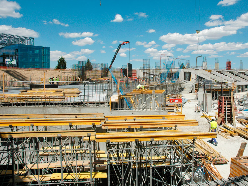 Debajo de los pórticos, se ha dispuesto de forjados de hormigón armado o postesado, para crear las diferentes plantas y sótanos del estadio. Estas zonas, se han realizado también con encofrado ENKOFORM, esta vez, apeado con puntales EP. Para su realización, se hizo un análisis detallado conjuntamente con el cliente y se determinó que esta iba a ser la mejor solución.