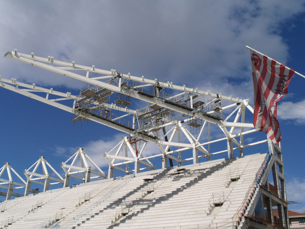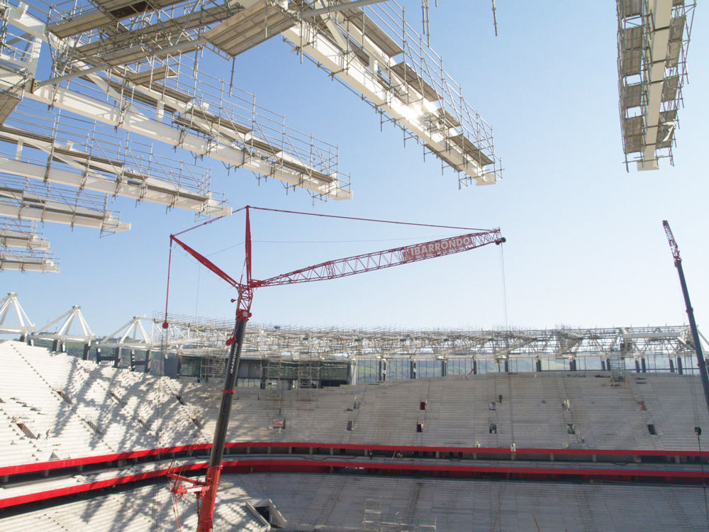 Las plataformas de trabajo de andamio que se han dispuesto para facilitar los trabajos de montaje y unión de la estructura de la cubierta se han montado en su mayor parte a nivel de suelo, posteriormente se han izado junto con las cerchas de la cubierta a su ubicación mediante autogrúas, realizándose las labores de acabado y conexión de dichas plataformas de trabajo de andamio en altura.