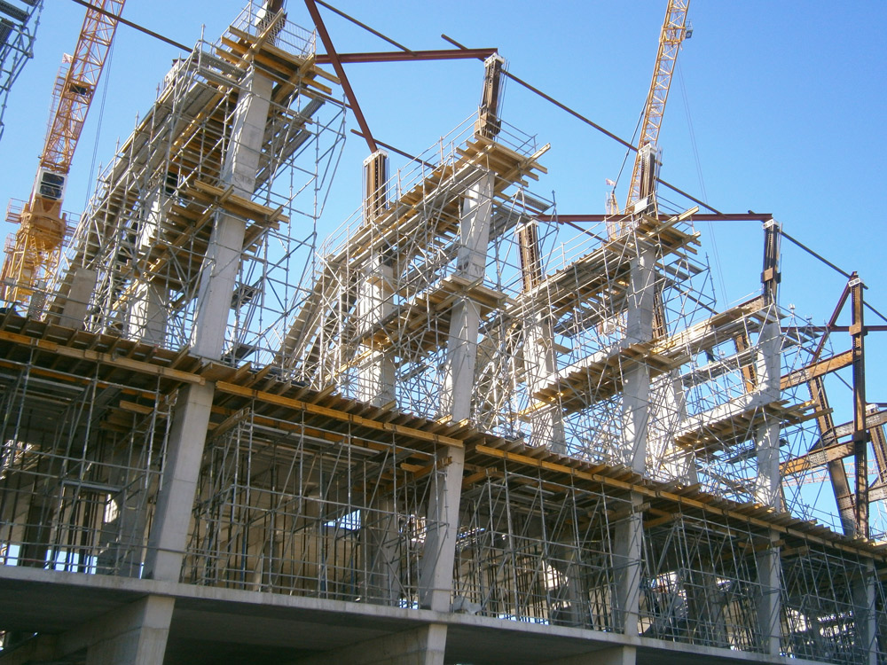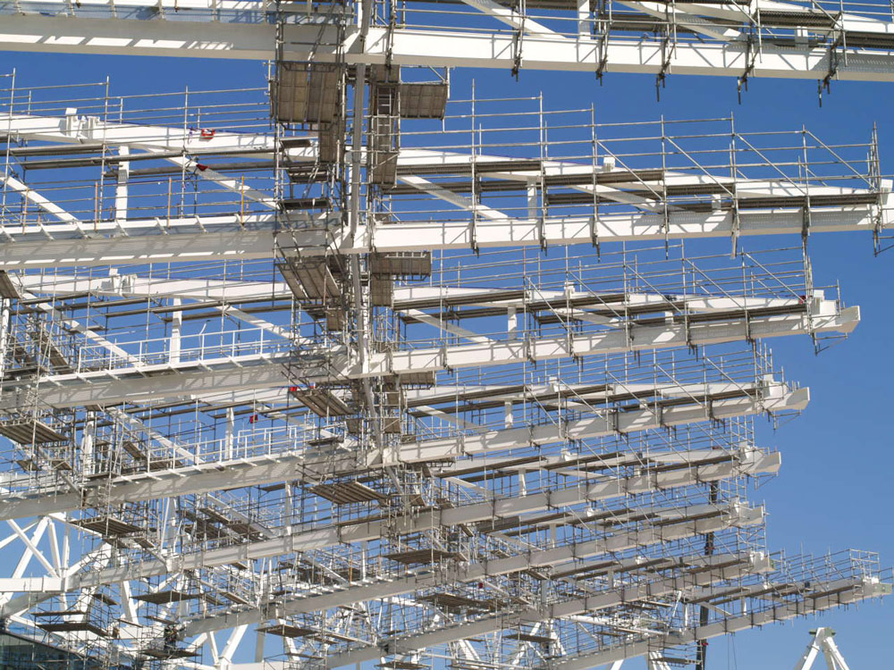 Los pórticos de la estructura de hormigón de 28 m de altura que vuelan hacia el exterior se han cimbrado en voladizo desde la propia estructura de hormigón, sin apoyar en el suelo para no interferir con otros trabajos en el perímetro exterior de la obra y para conseguir una alta productividad.