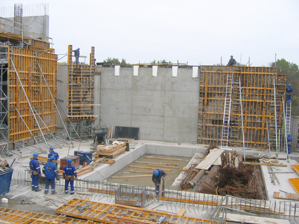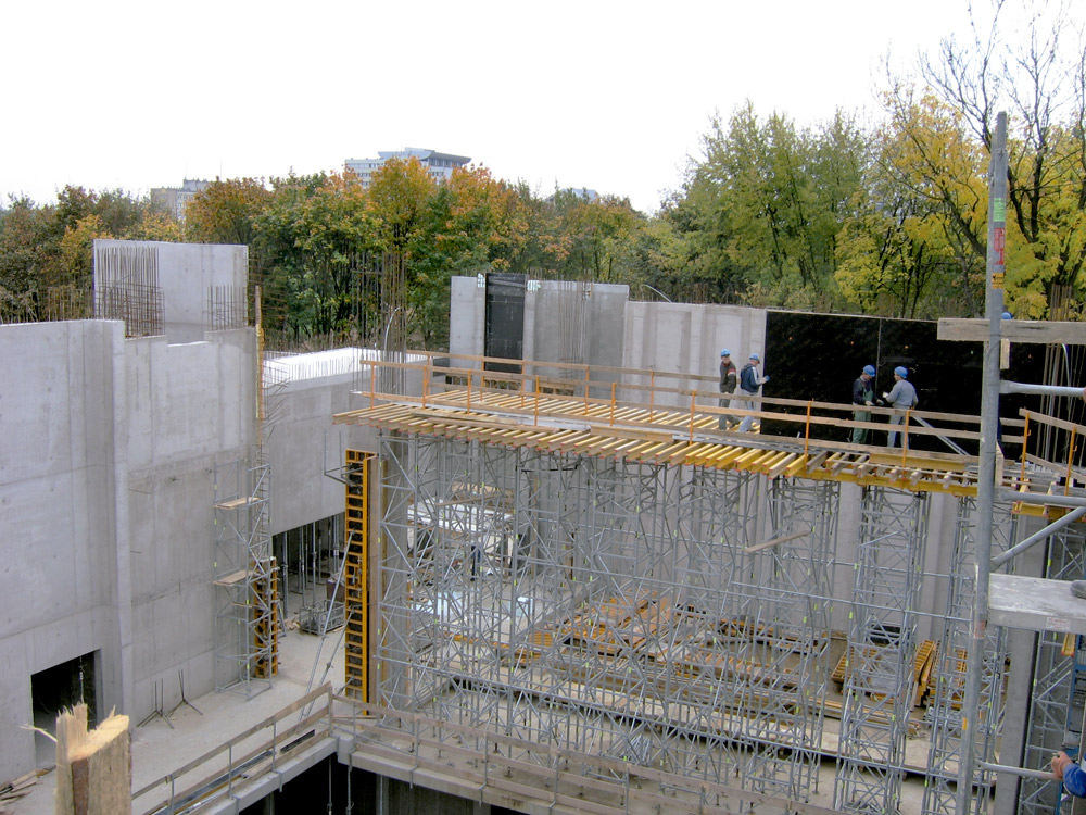 Los muros del salón principal, la zona de mayor altura de todo el edificio, se llevaron a cabo en ciclos de hormigonado de 6,6 m de alto, con el empleo de paneles de 2 x 3,3 m, de encofrado modular. En todo momento se utilizaron plataformas de trabajo y de hormigonado que garantizaron la seguridad de los trabajadores durante toda la obra.