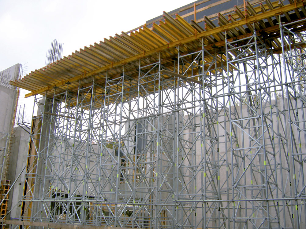 El reto fue la ejecución, en una sola fase, de muros de 10 m y pilares de 15 m de altura de hormigón visto, sobre los que se realizaron vigas horizontales de hormigón. En la construcción de estas vigas, se utilizaron torres T-60 de 11 m de altura y encofrados verticales modulares.