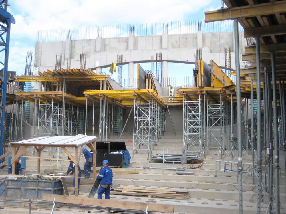 Para la ejecución de la primera fase de la estructura del edificio principal (con una superficie útil de 9.424 m2, área construida de 6.302 m2 y salas con aforo para 1.000 y 200 asientos), se planteó el suministro global de encofrados. En la mayor parte del proyecto se empleó la tecnología del hormigón arquitectónico.