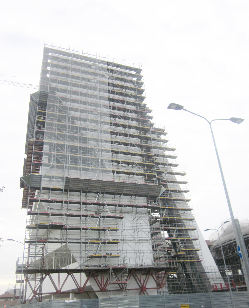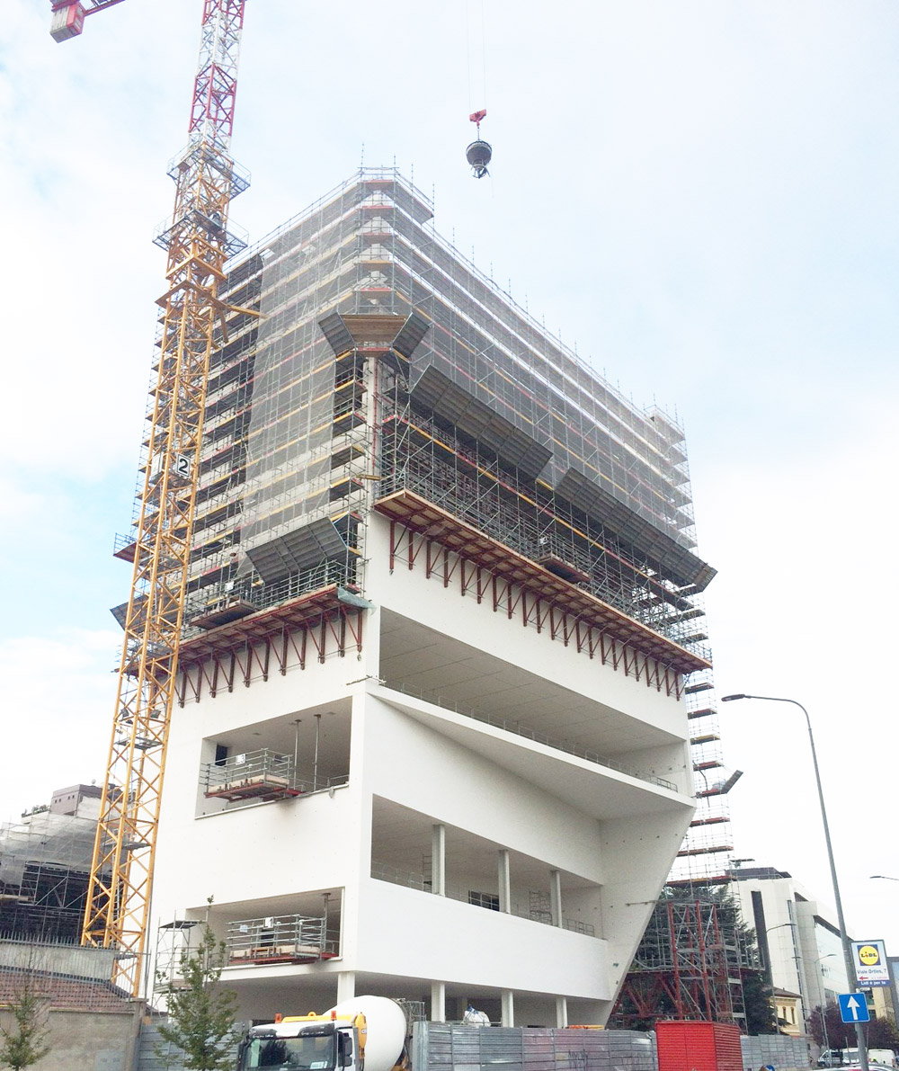 Para su construcción se ha planteado una solución creativa de encofrado y apeo, adaptada perfectamente a las necesidades de la obra. Se ha utilizado cerca de 2.000 m2 de ENKOFORM VMK para los muros y 1.200 m2 para losas, cada 2 plantas. Se ha cumplido así con las geometrías y los patrones diseñados por el arquitecto.