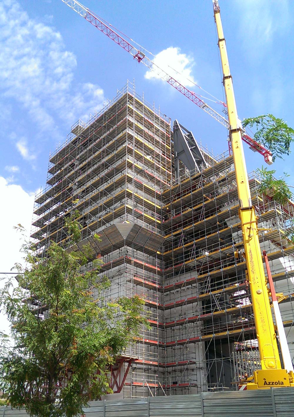 Con 8 cerchas MK ha sido posible hormigonar la segunda planta en voladizo desde la propia calle. También han servido como apoyo de la pasarela de acceso a la zona norte. Y como soporte del encofrado y andamio, las consolas MK han cubierto todo el perímetro durante la obra dejando así libre el suelo para labores de acabado del edificio.