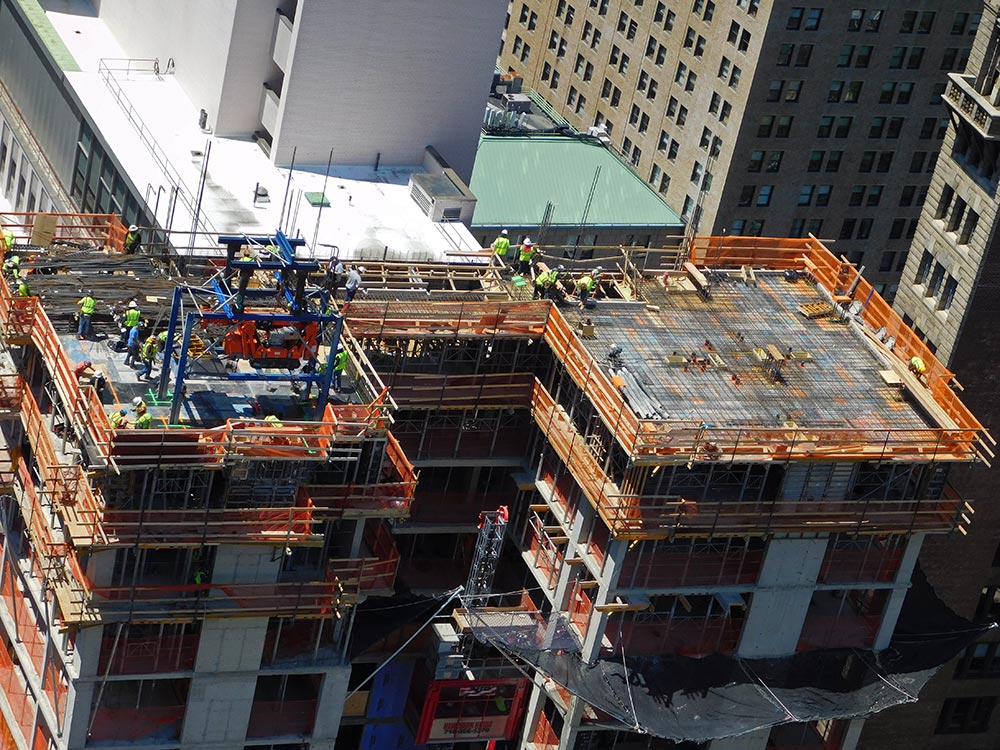Para el encofrado de losas de las 30 plantas, el cliente ha seleccionado el encofrado modular de aluminio CC-4. Al disponer de cabezales de caída es ideal en aquellos espacios donde las exigencias de seguridad son elevadas. La temprana recuperación del material ha reducido la necesidad de equipos en obra y una menor utilización de la grúa. Al requerir menos puntales por m² ha facilitado los movimientos bajo la losa, así como el desplazamiento de materiales, importante a medida que el edificio crece en altura.
