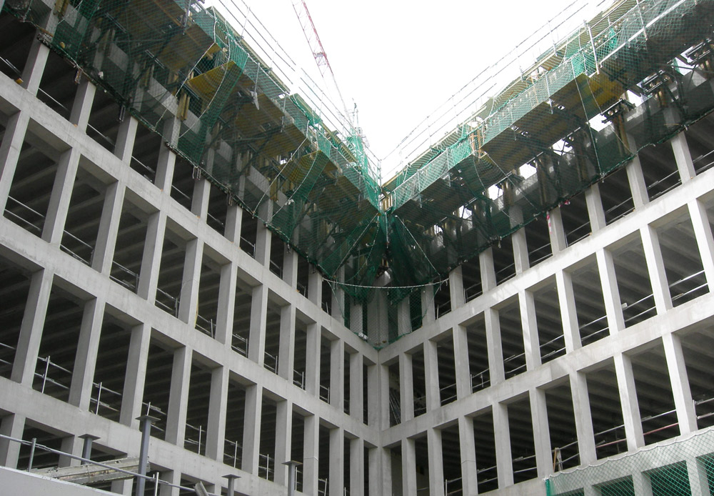 Está proyectado con una crujía homogénea de 12,40 metros, sin pilares intermedios, que da forma a los cuerpos edificatorios de ocho plantas que se entrelazan generando una figura singular.