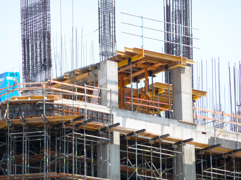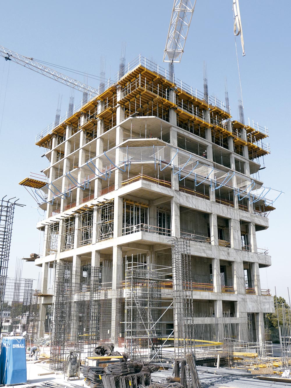 Al tratarse de un edificio de gran altura, la ejecución de losas se llevó a cabo mediante el sistema Mesa VR. Este encofrado se montó al inicio de la obra, puntales inclusive, y se trasladó sin desmontar de una zona a otra utilizando para ello una grúa. Una vez que se realizó el vaciado y se alcanzó la resistencia requerida, los puntales se retrajeron. Con la ayuda del Carro VR se orientó hacia el exterior para que la grúa desplazase el material.