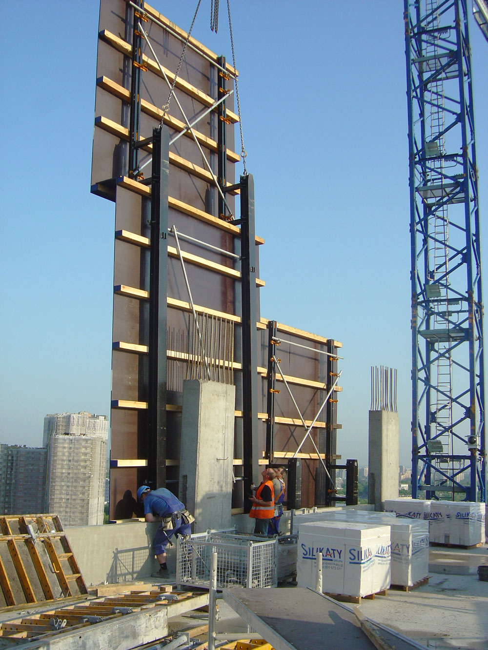 Además, se suministraron durante tres meses 33 protecciones perimetrales, de 10,5 m de altura cada una, utilizadas para asegurar las zonas de trabajo al ejecutarse los pisos de forma consecutiva. Así los operarios pudieron trabajar de forma eficiente y protegidos del viento y de las inclemencias meteorológicas a grandes alturas. El mecanismo se basa en un conjunto de dos mástiles unidos entre sí por vigas de acero y vigas de madera. Cada mástil, suspendido de un par de cabezales montados en las losas, determina el sentido de movimiento de cada protección. Gracias a la eficacia de este sistema, la ejecución del perímetro exterior de las losas superiores resultó sencilla, además incrementó de forma considerable los ritmos de trabajo con el consiguiente ahorro de tiempos.