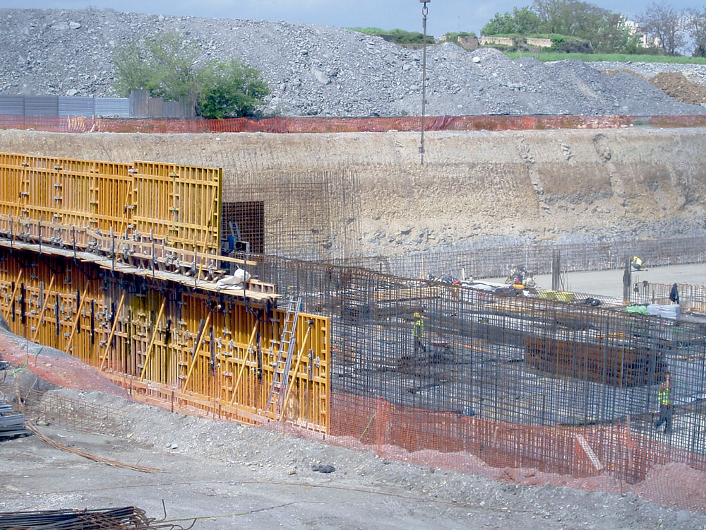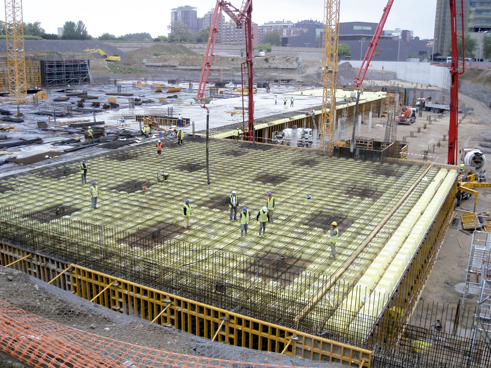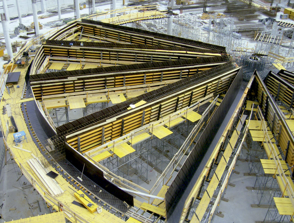 En la ejecución de muros se utilizó Encofrado Modular ORMA consiguiendo en todos los casos un perfecto acabado de hormigón visto. Cuando no fue posible emplear paneles enfrentados, por las características del entorno, se emplearon sistemas de encofrado a una cara para resistir la presión del hormigón. Las múltiples geometrías de pilares se solucionaron con Encofrado Circular CLR, los cilíndricos y con ENKOFLEX y ORMA, aquellos que disponían de capiteles, etc.