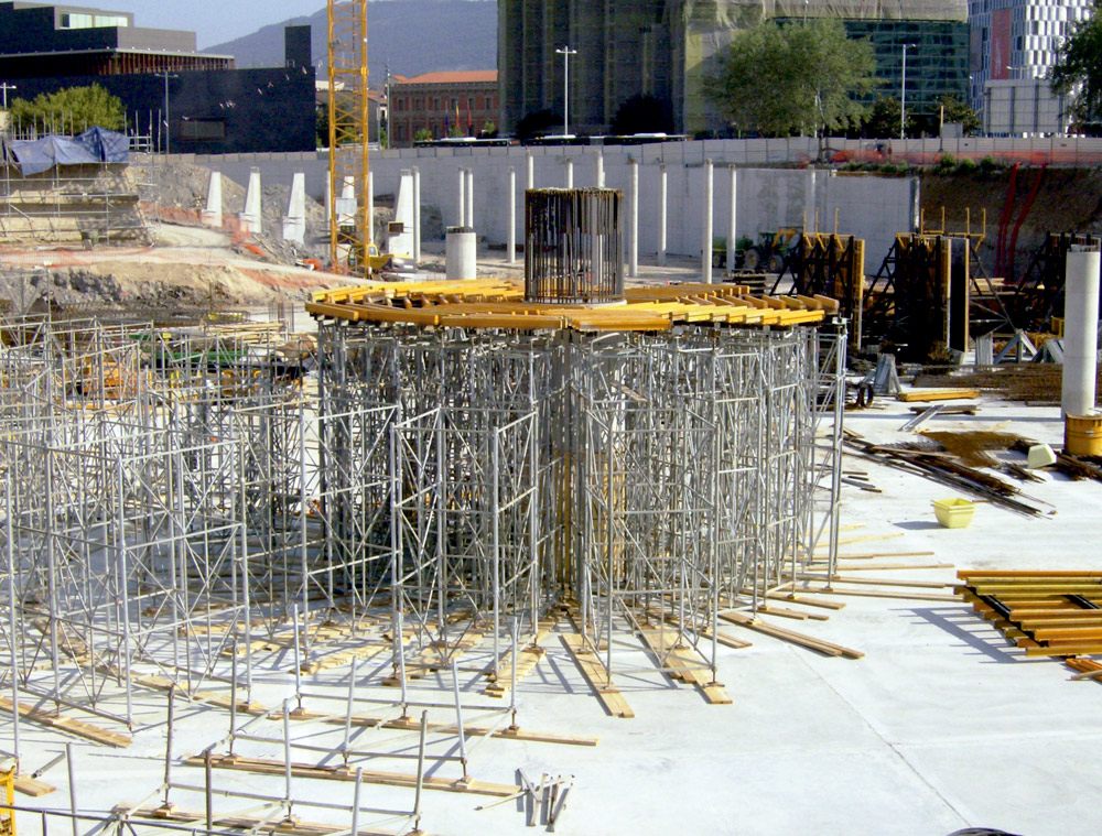 En la ejecución del núcleo central del edificio se empleó como encofrado de las vigas ENKOFORM HMK y como apeo, una cimbra modulada de manera que se adaptó a la geometría radial.