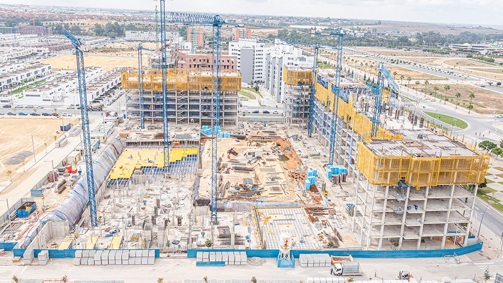 El complejo residencial consta de cuatro bloques, distribuidos en ocho portales, y está formado por una estructura de hormigón, con dos plantas de sótanos, más ocho plantas y cubierta sobre rasante.
