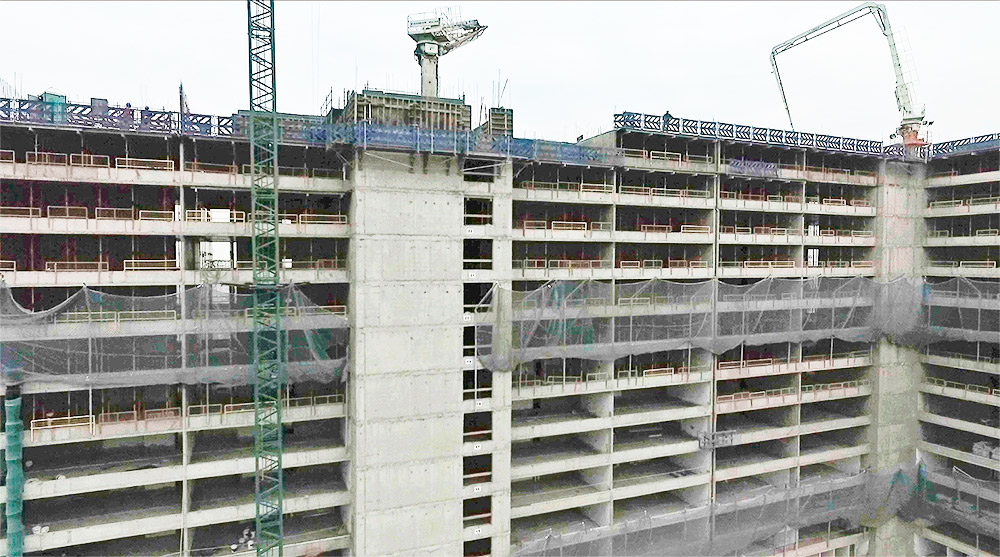 Con el sistema ORMA ha quedado patente el ahorro que supone su empleo en la construcción de muros. Cada torre con 1.490 m² de muros a dos caras se han realizado con el 65% de encofrado ORMA, combinado con consolas de trepado convencionales para solucionar los muros ciegos. La rotación de los equipos se ha planificado hasta el mínimo detalle para obtener el máximo rendimiento. En esta línea se han empleado puntales SP-30 en alturas de losa de 2,52 m reduciéndose así el número de puntales en un 25%.