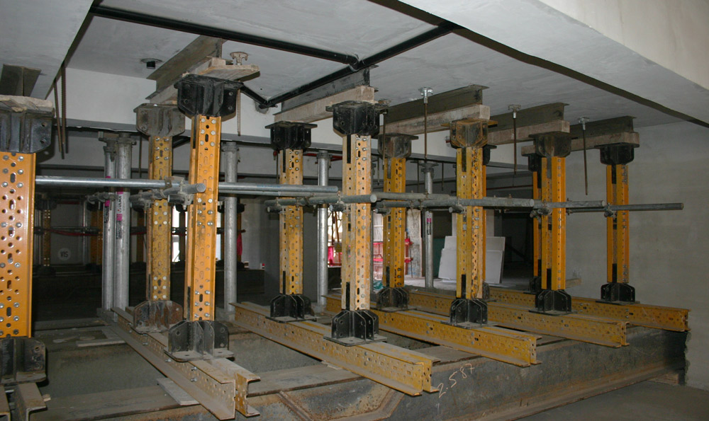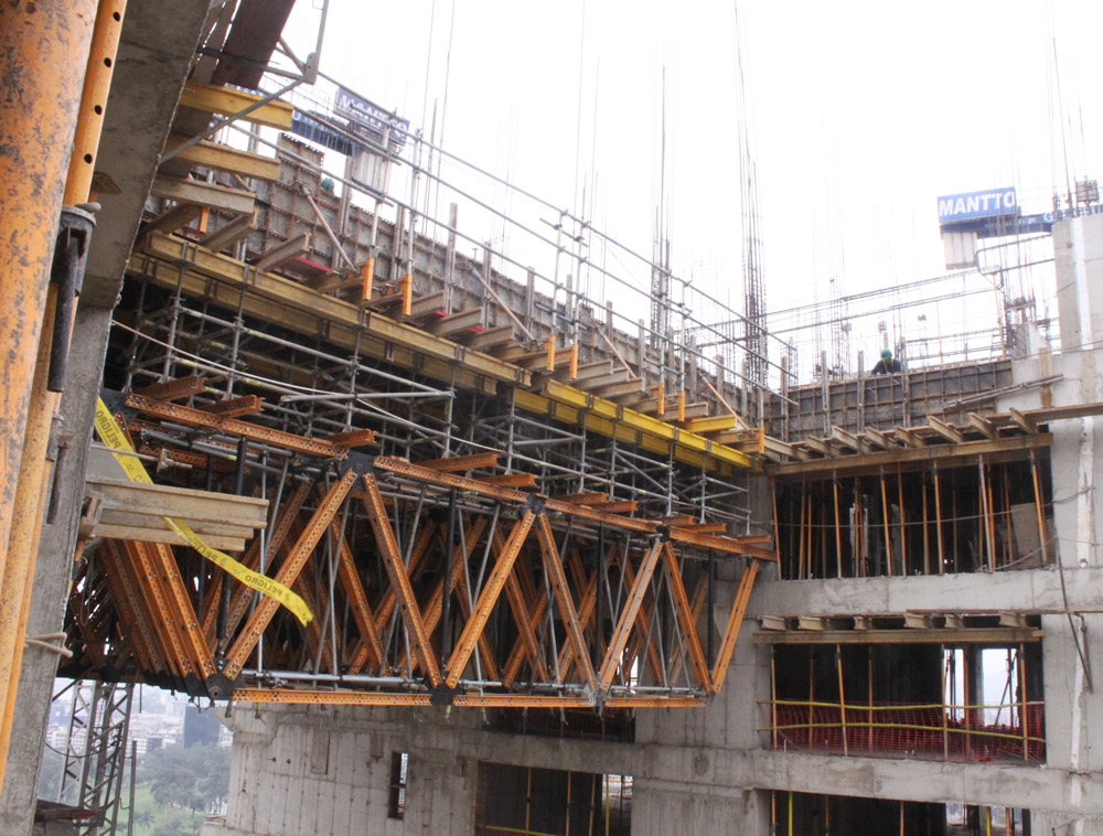 Ahora el tema estaba en poder reapuntalar las vigas involucradas en las zonas en donde se apoyan las vigas metálicas W21x73, para este propósito, se decidió emplear Puntales MK de 15 Ton de capacidad, los cuales en su parte superior tienen una Riostra MK-180, que se encarga de distribuir de manera equitativa la carga a los puntales. Mediante esta solución se transmitió la carga de viga a viga de los niveles inferiores para finalmente llevarlo al terreno.