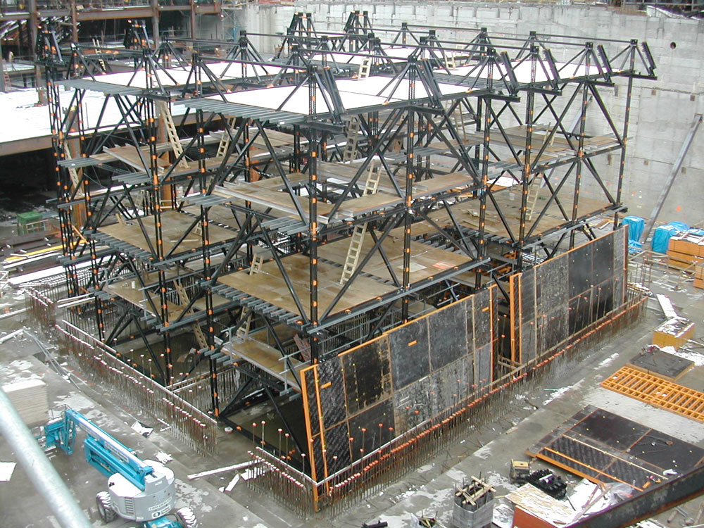 Asimismo este sistema permite el montaje y preparación de los mecanismos de elevación y sus plataformas antes que los encofrados. Funciona a modo de una torre de elevación, anclándose a los muros ya ejecutados de la estructura.