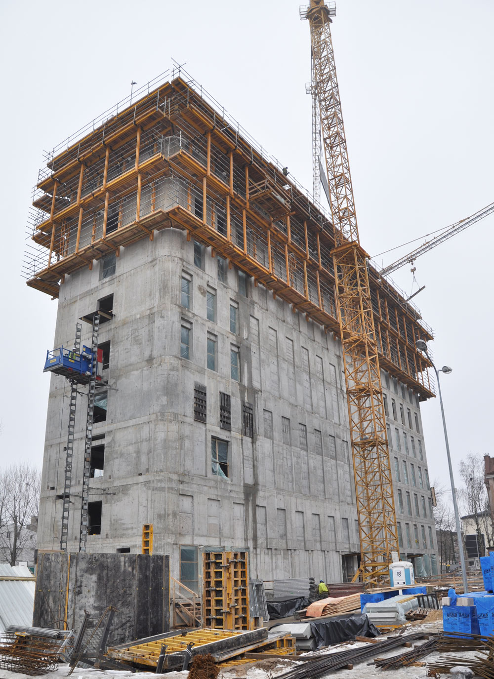 El edificio se construyó con 22 estructuras de 6 y 7 m de anchura, cada una con 4 niveles de plataformas: de hormigonado, la principal que soporta en este caso el encofrado vertical ORMA, de control desde donde se accionan los cilindros y de recuperación de conos.