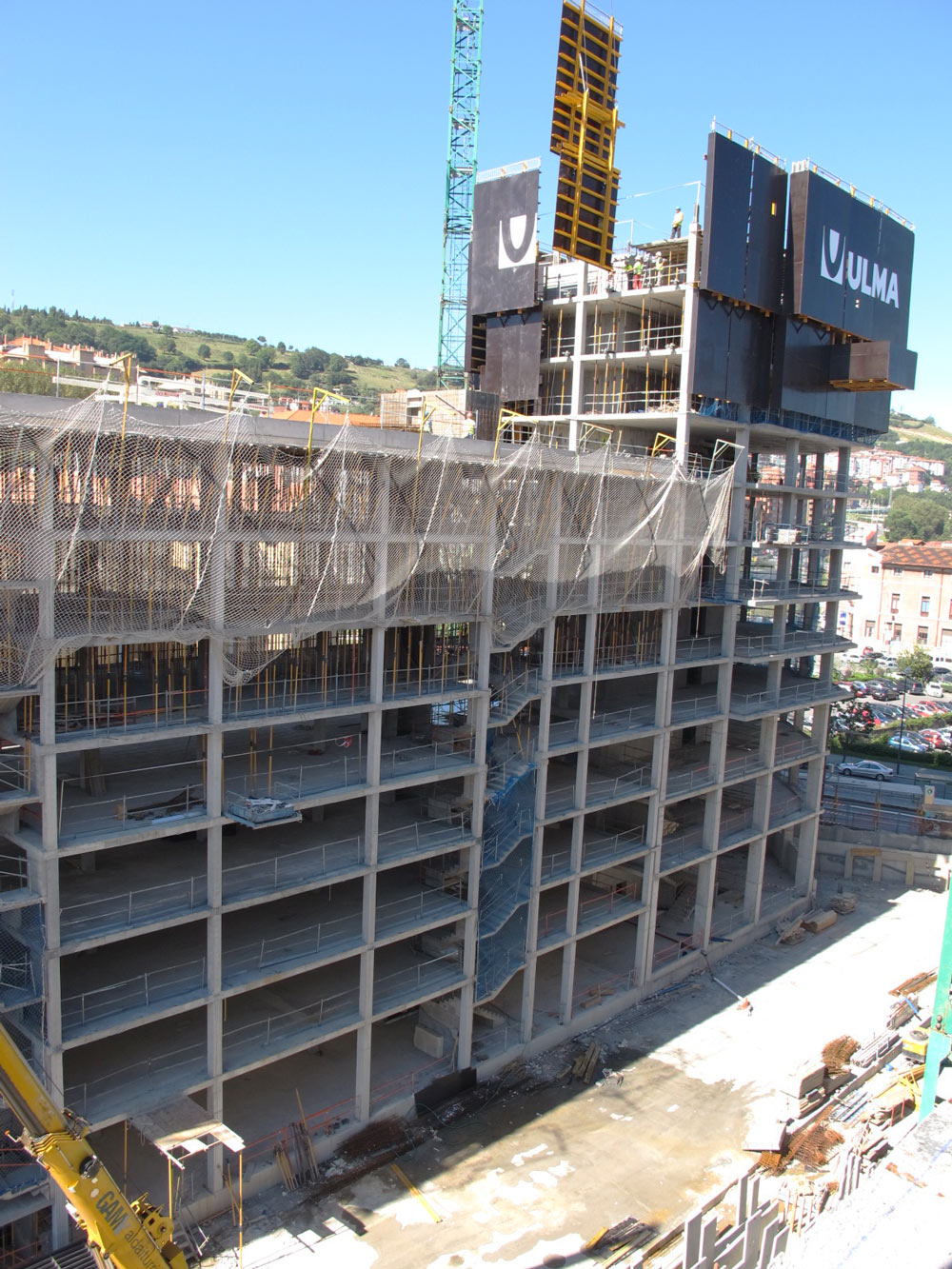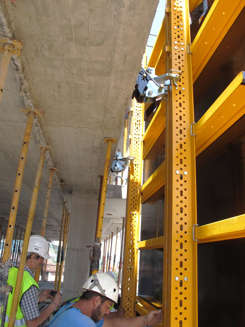Los forjados de los edificios de losa maciza de espesores variables de 20 a 30 cm se han resuelto con el encofrado recuperable RAPID y puntales SP. Para la ejecución de los pilares y muros de los núcleos centrales de ascensores, escaleras y patinillos se ha utilizado el encofrado modular ORMA.