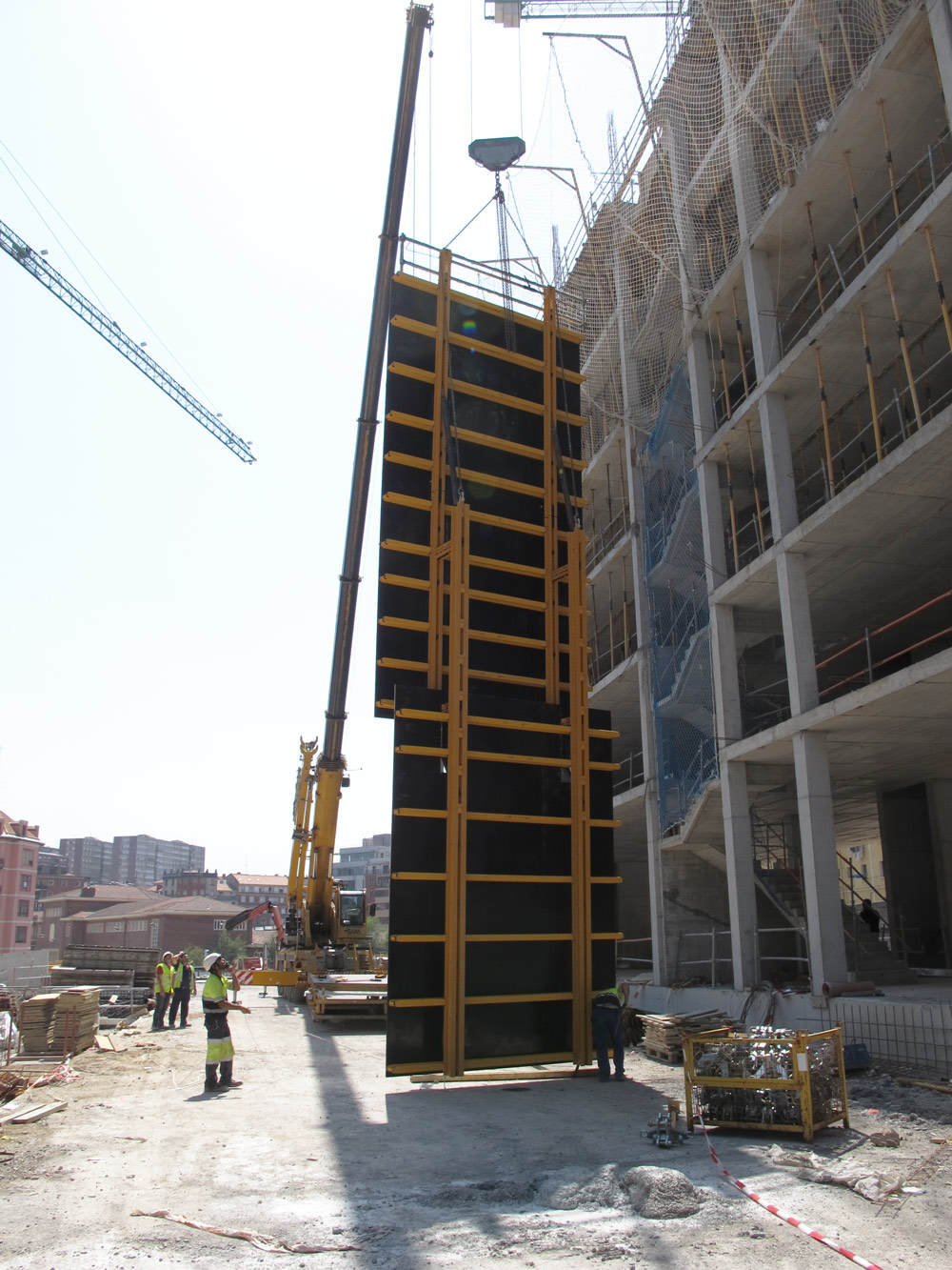 Con el sistema HWS mediante paneles de 12 m de altura y anchuras que oscilan entre los 2,45 m y los 5,20 m, se ha conseguido cubrir 4 plantas en cada edificio, con el fin de evitar la caída en altura de personas y de materiales de obra durante las labores de encofrado, hormigonado y desencofrado. Además ha servido de parapeto contra el viento y evitado el efecto visual de la altura.