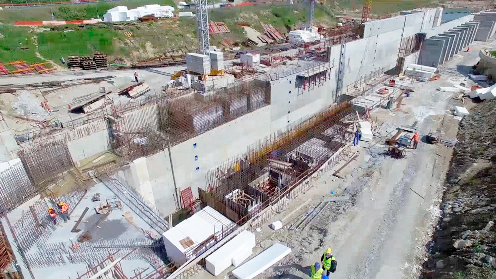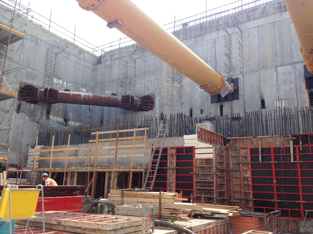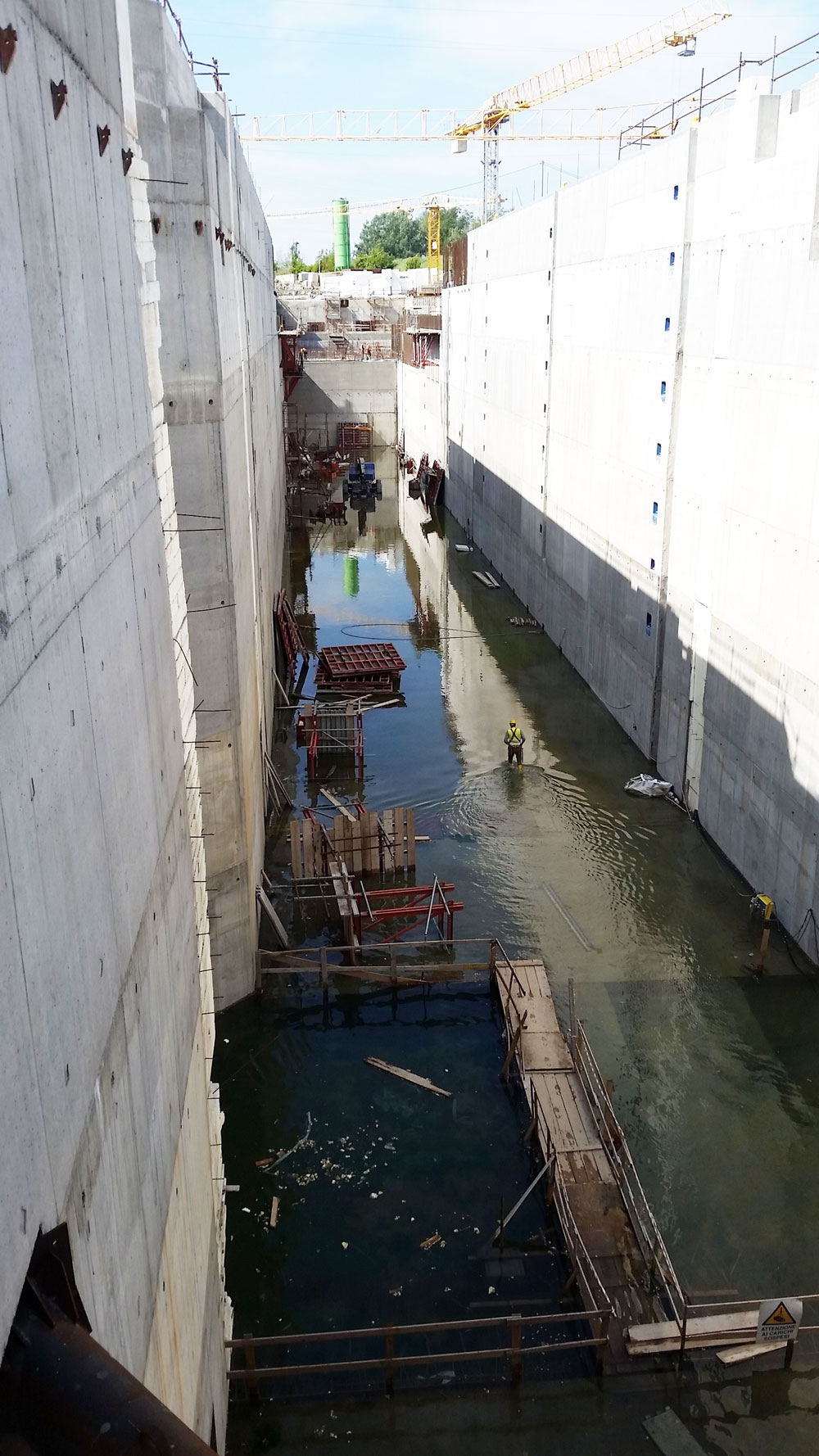 En la ejecución de los muros perimetrales de más de 30 m de altura en tongadas de 6 m se han mantenido los estándares de seguridad y el cronograma establecido por el cliente. Con más de 320 m de longitud y 5.000 m², los muros a una cara de 15 m de altura bajo el nivel de las aguas se han hormigonado en 8 tramos de 20 m.