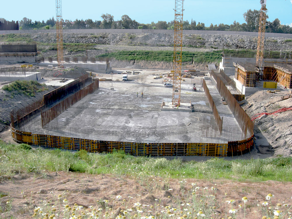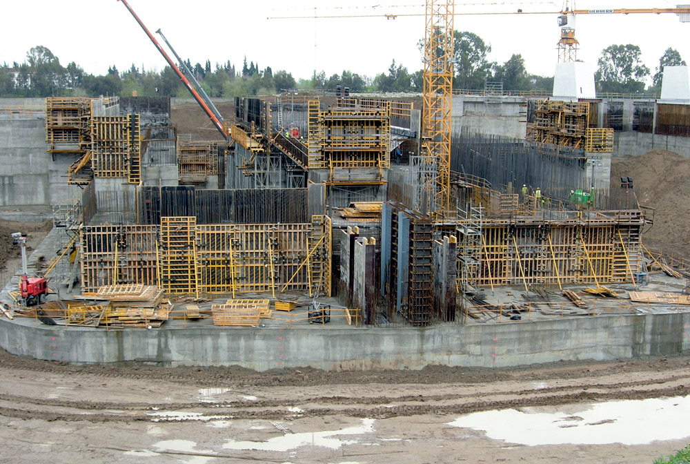 Las pantallas, los difusores, los contrafuertes, los garajes y contragarajes se realizaron con consolas de trepado y Encofrado ORMA. Esta solución, por su rápido montaje, fue la óptima para este tipo de estructuras. Además, en estas mismas zonas, se diseñaron velas especiales para hacer trepados a una cara de 4,5 m, con presiones de hormigonado controladas. Las galerías de los canales, así como los difusores se ejecutaron con cimbras y Encofrado Horizontal ENKOFORM HMK, con espesores de losa de hasta 2 m.