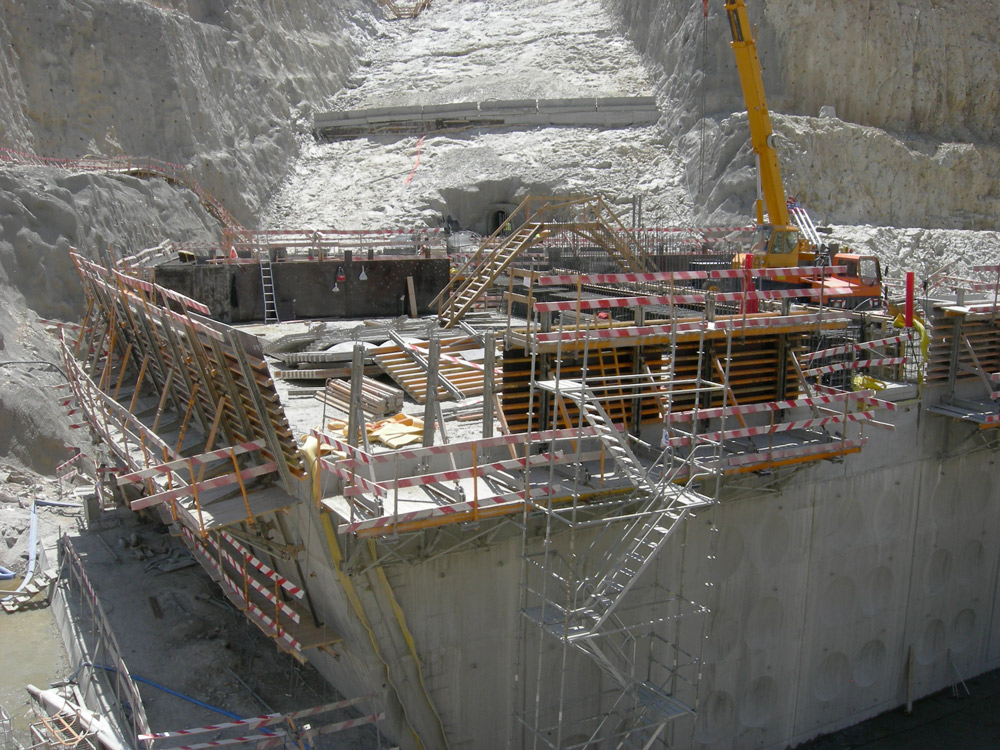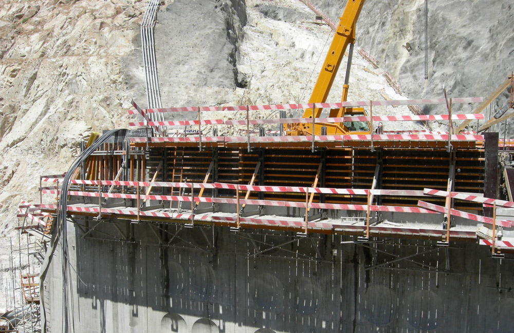 La seguridad a gran altura estuvo siempre garantizada. Gracias a las consolas de trepado 2000 y G, las plataformas de trabajo horizontales permitieron trabajar sobre el muro de la presa al margen de su grado de inclinación.