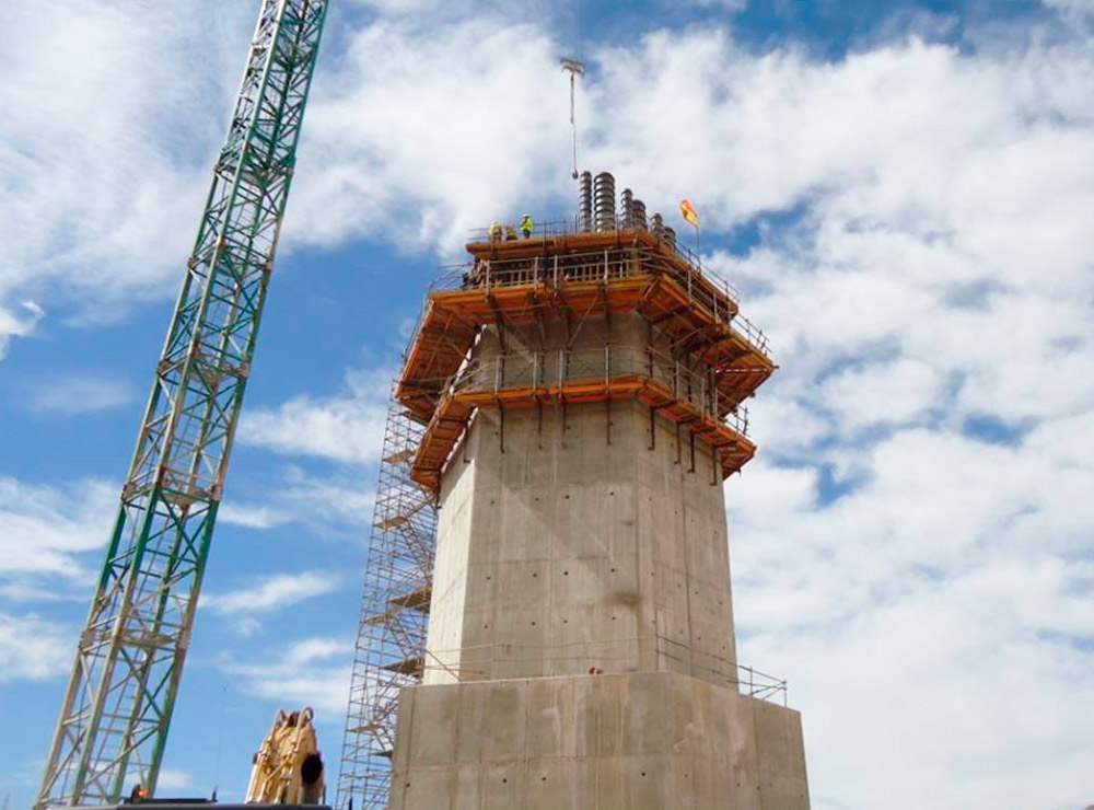 La torre de toma, que junto con la cámara de válvulas alcanza una altura de 90 metros, se ha ejecutado con trepados de 2 metros de altura mediante la Consola 2000 y el encofrado de vigas de madera ENKOFORM V-100 en los muros rectos. Para los muros de la zona superior de la torre, que en sus últimos 10 metros de altura tiene una geometría cilíndrica de 13,5 metros de diámetro, se ha utilizado el encofrado circular FLECTOR.