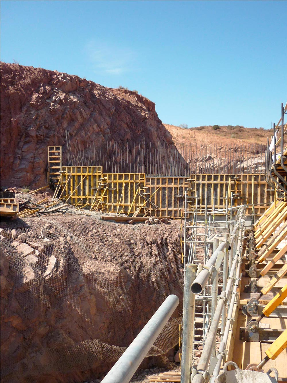 La cámara de válvulas de 55 metros de anchura se ha realizado mayoritariamente con el Encofrado modular ORMA, con la Consola de trepado 2000 y con las cerchas UCAB-EUC. En las losas de poco espesor se ha utilizado el encofrado de losa RAPID y el encofrado de vigas ENKOFLEX y en las losas de mayor potencia, en cambio, (espesor mayores de 70 cm.) el encofrado de losa ENKOFORM H-120.