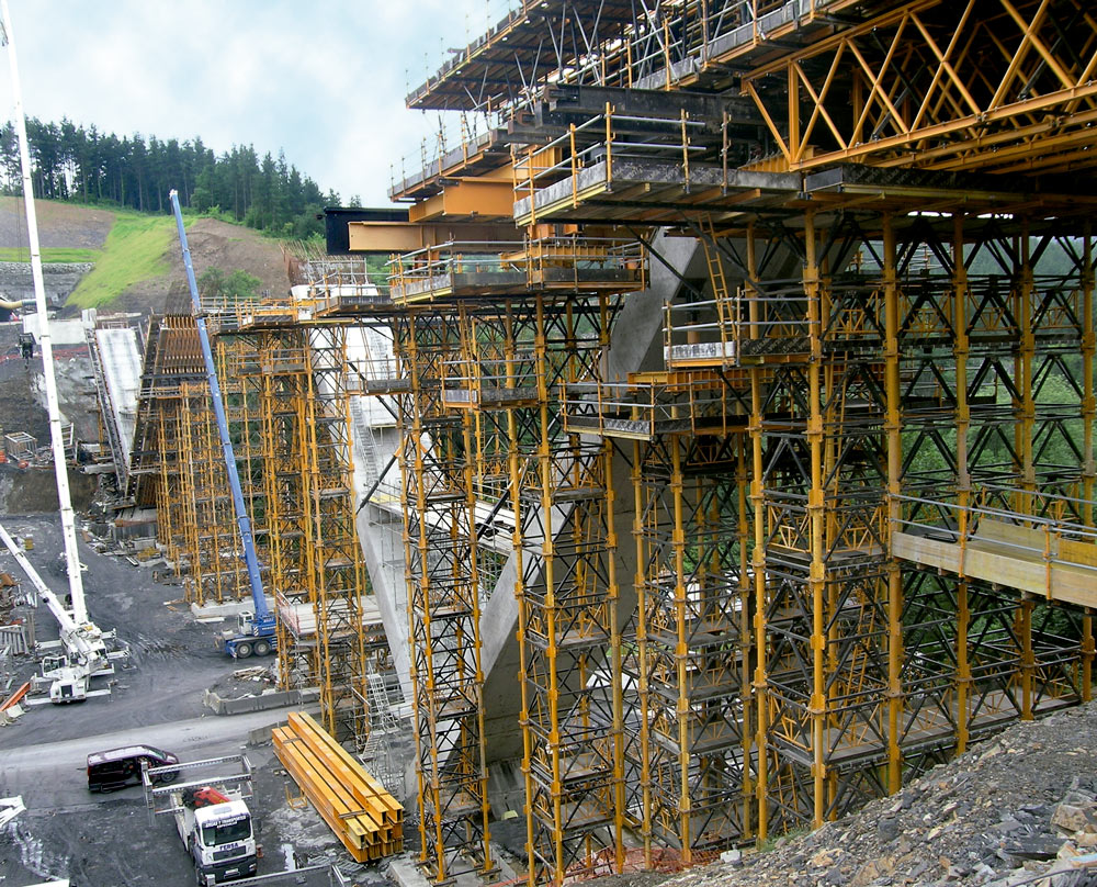 Para la ejecución de las pilas se emplearon los mismos productos en el mismo proceso, en los tres casos: encofrados con riostras, y vigas sobre Estructuras H-33, con longitud suficiente para el hormigonado de ambas fases, 35 m de longitud. Mientras, los paños de encofrado de Vigas HM-500 se conformaron con tablero fenólico, vigas y riostras, todo el conjunto apoyado sobre Estructuras H-33, colocadas a 0,5 m entre cada una. La unión entre los paños se efectuó con Barras DW. La transmisión de cargas de estas pilas al terreno se realizó mediante dos grupos de torres T-500. Además, se transmitieron cargas al plinto de la pila mediante perfiles con barras de atado y cuñas de desencofrado.