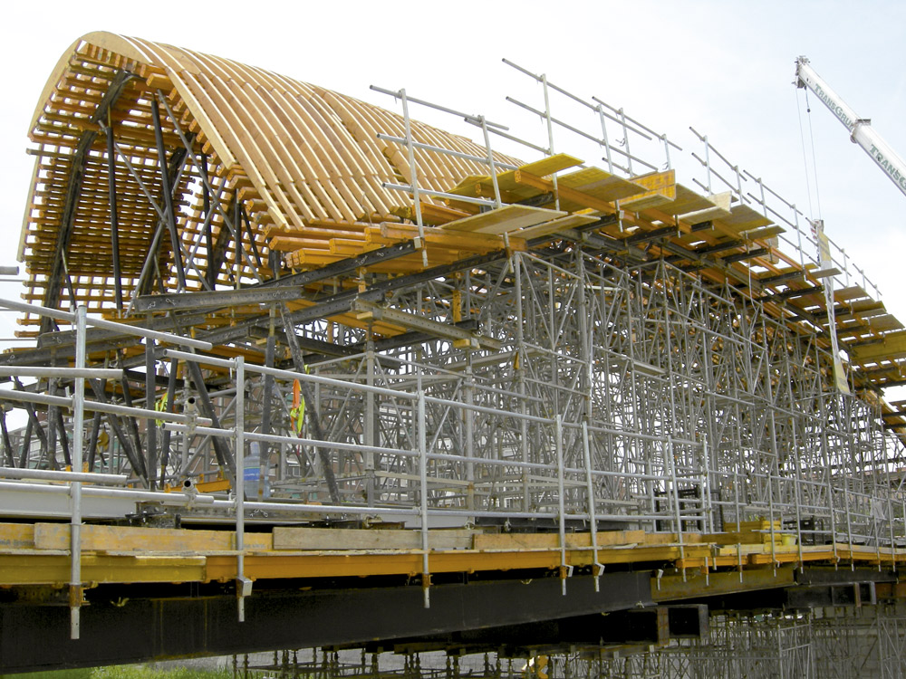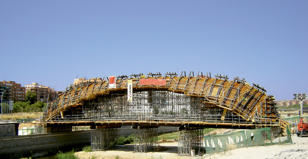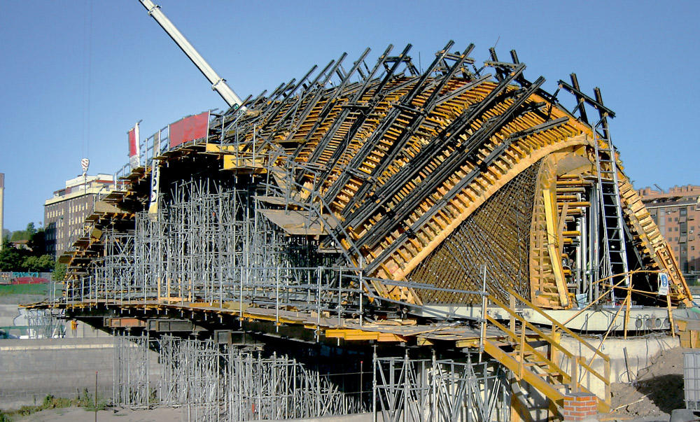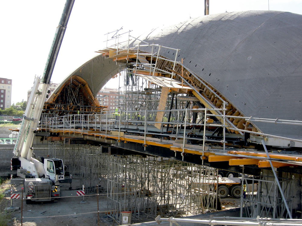 Esta estructura metálica requirió de un sistema de apeo robusto desde el ensamblaje en obra hasta la colocación de los tirantes de cuelgue. De ahí que se empleasen cimbras capaces de soportar las cargas del tablero y del conjunto de apeo de los paños. Un material galvanizado de concepción simple y montaje rápido, que ofreció todas las garantías de robustez, seguridad, así como una gran flexibilidad de utilización.El sistema ENKOFORM H-120 se adaptó al arco longitudinal, y resolvió la doble curvatura de la sección del hormigón. Posteriormente se forraron con camones de madera en ambas caras.