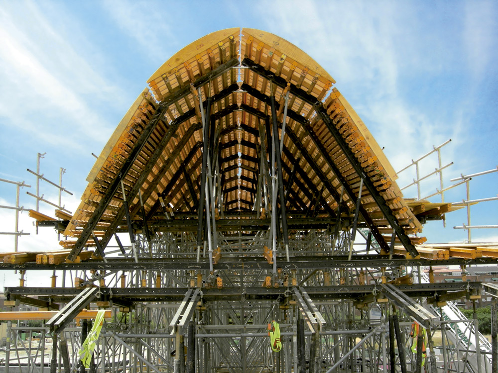 Al tratarse de un diseño de vanguardia de excelentes acabados de hormigón visto, en la “cáscara” se utilizó una superficie encofrante de tablero fenólico de 21 mm de espesor en la cara interior, y de 22 mm en la cara exterior. Los paños se apoyaron en torres de cimbra, situadas sobre el tablero de la pasarela.