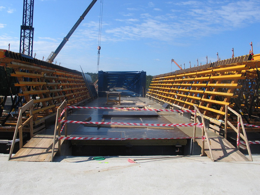 Ambas estructuras se dividieron en 34 segmentos de hasta 22,5 m que después se empujaron. Cada calzada alcanzó cerca de 15.000 toneladas de peso en la última fase de ensamblaje.