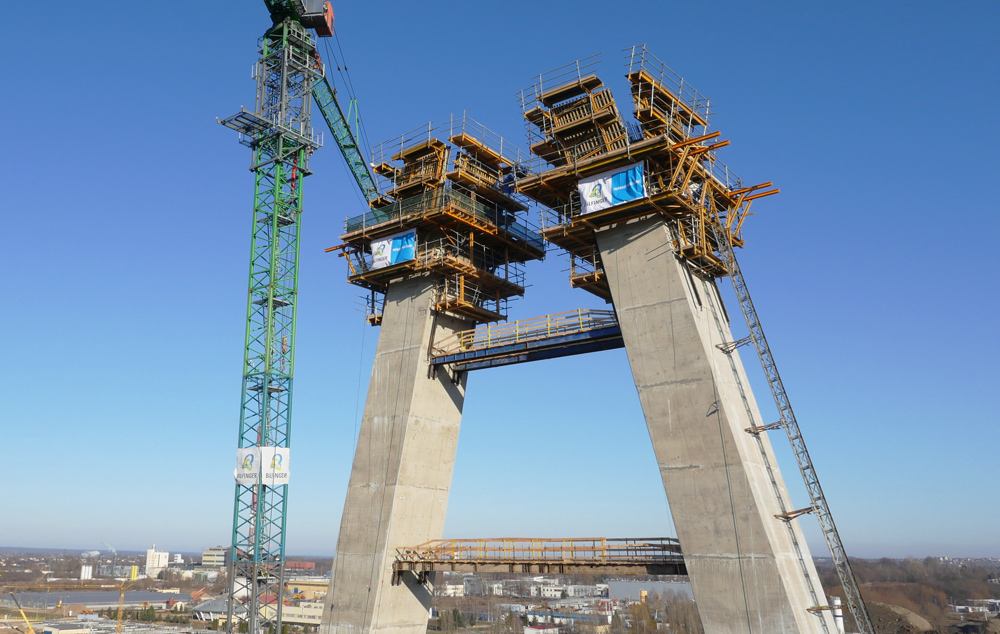 En la fase inicial se ejecutaron los segmentos de arranque de los brazos del pilono. Se trata de unas estructuras de 14,5 de altura y sección en T ejecutadas con el encofrado ENKOFORM VMK que posteriormente se utilizaron para la instalación de los sistemas autotrepantes. Para garantizar la seguridad al personal que realizaba las labores de instalación y hormigonado en los elementos inclinados de la estructura, el sistema de encofrado se dotó de cuatro niveles completos de plataformas de trabajo con comunicación vertical entre ellas.