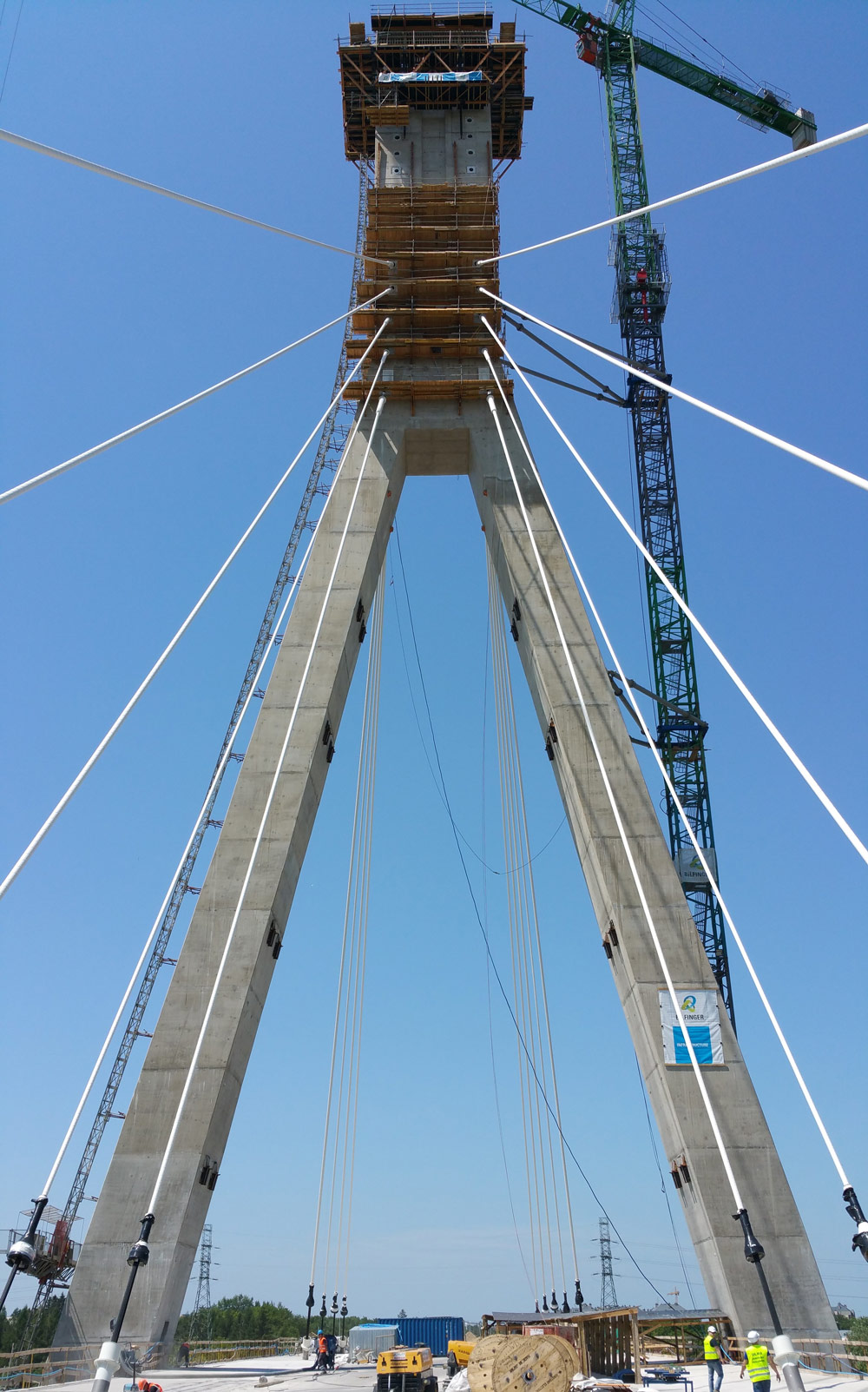 El elemento singular es un pilono de 108,5 metros de altura, de hormigón armado. El hormigonado del pilono se ha realizado en 26 fases: en las primeras 14 se han ejecutado los brazos del pilono, en las 3 posteriores se ha hormigonado el dintel y las últimas 9 han completado el segmento de atirantado.
