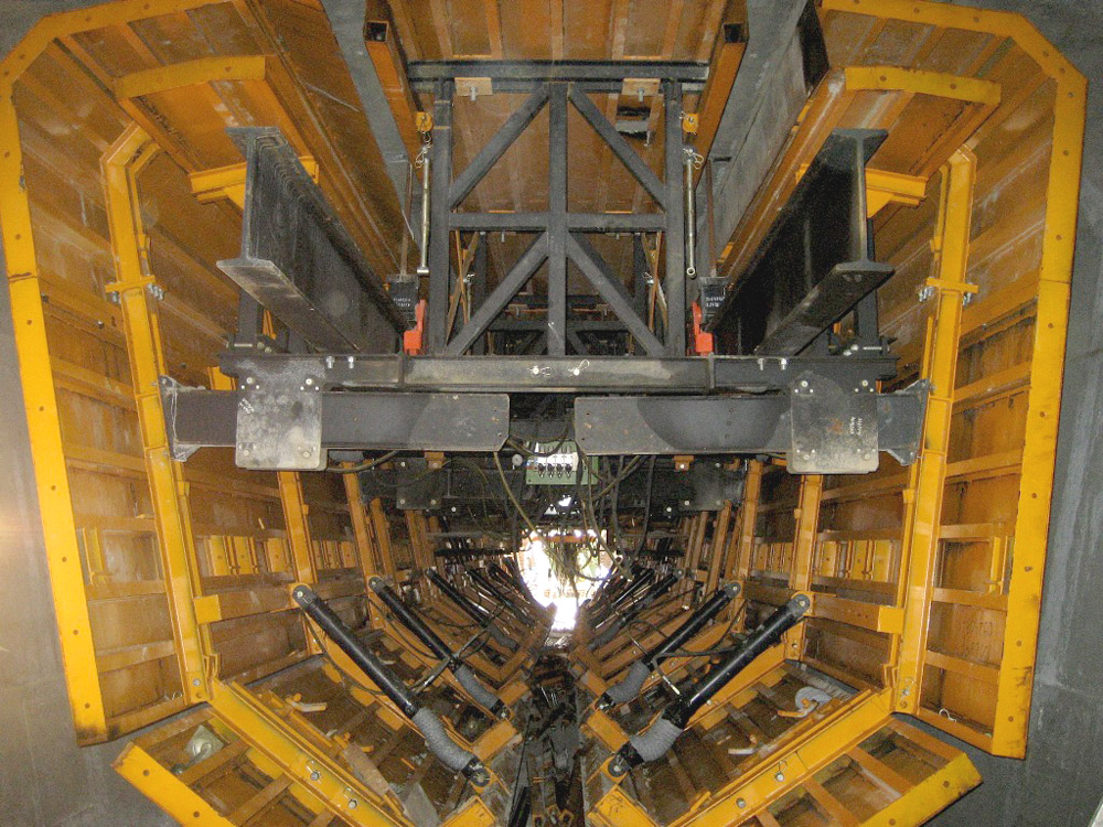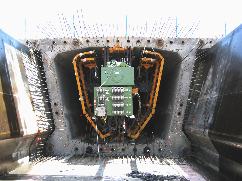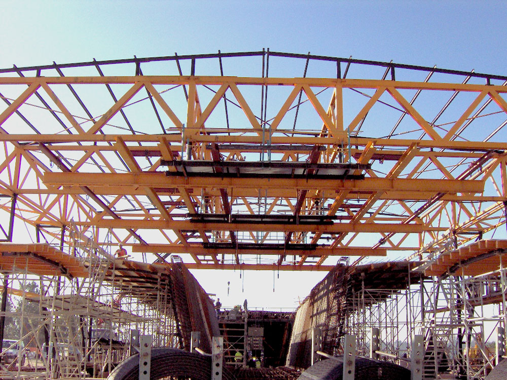 Este sistema permitió el hormigonado en una sola fase de la dovela completa. Tras finalizar el hormigonado, se actuó sobre el sistema hidráulico que despegó el encofrado exterior, así se empujó la dovela trasladando consigo el encofrado interior solidario.