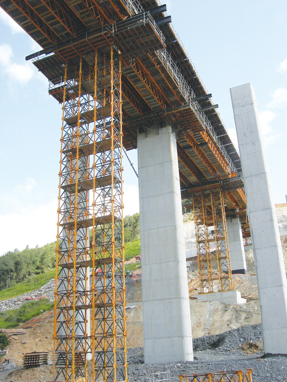 El apoyo se basa en una cimbra porticada con T-500 y Cerchas H-33, transmitiendo cargas a una torre provisional por vano y a las pilas mediante el uso de Consolas MT.