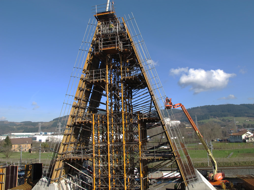 Para ello, el encofrado interior se ha montado con la inclinación de la pila, estando unida a la cimbra T-500, formando un cuerpo o conjunto rígido que soporta el peso de toda la estructura a ejecutar.