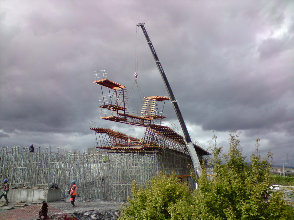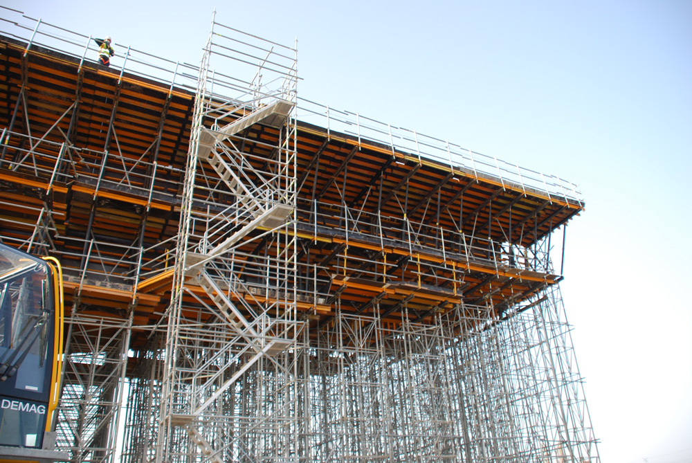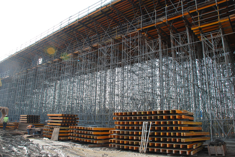 En la ejecución de los paños se han combinado medidas de 2,5 m, 3 m, 3,5 m y 4 m de longitud, apoyados sobre torres de cimbras formadas por las modulaciones 2,2 m 1,6 m y 1 m. La solución también incluyó, debido a la falta de espacio en la zona de los estribos, un paso de talud de pequeña altura 3,4 m. Los tiempos de montaje se redujeron ya que, con los sistemas de apeo empleados, todos los ensamblajes quedan siempre bloqueados en el montaje. Así no es necesaria ninguna verificación previa a la hora de transportar la cimbra con la grúa.